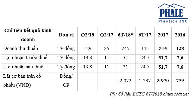 In the first 6 months, Pha Le Plastic gained VND 245 billion in net revenue and VND 31 billion in after-tax profit, increasing by 69% and 25% respectively compared to the first 6 months of 2017, fulfilling 58% of the revenue plan. and 51% of the year’s profit plan. 6 months EPS is 2,072 dong.